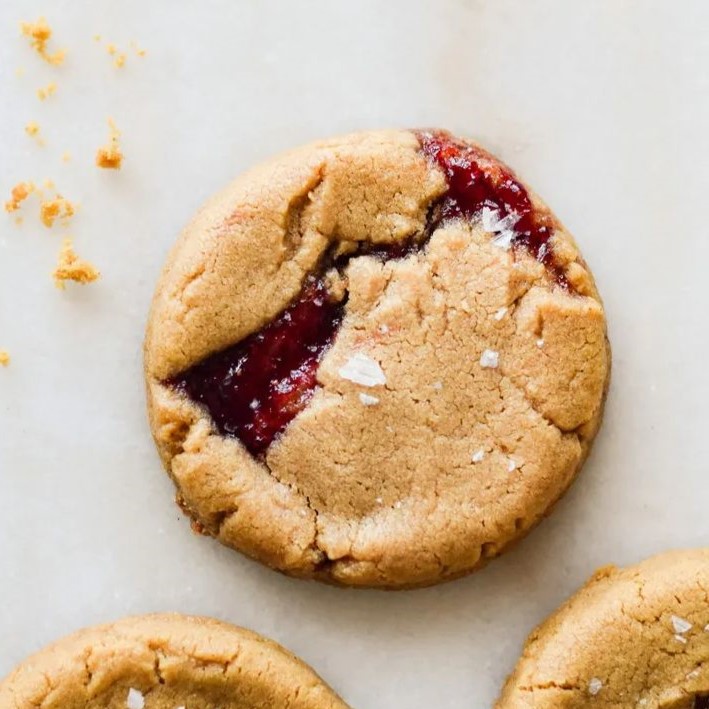 Una galleta que abraza lo mejor de dos mundos: masa suave con mantequilla de man y un centro irresistible de jalea de fresa. Cada mordida es una mezcla dulce y salada que enamora.